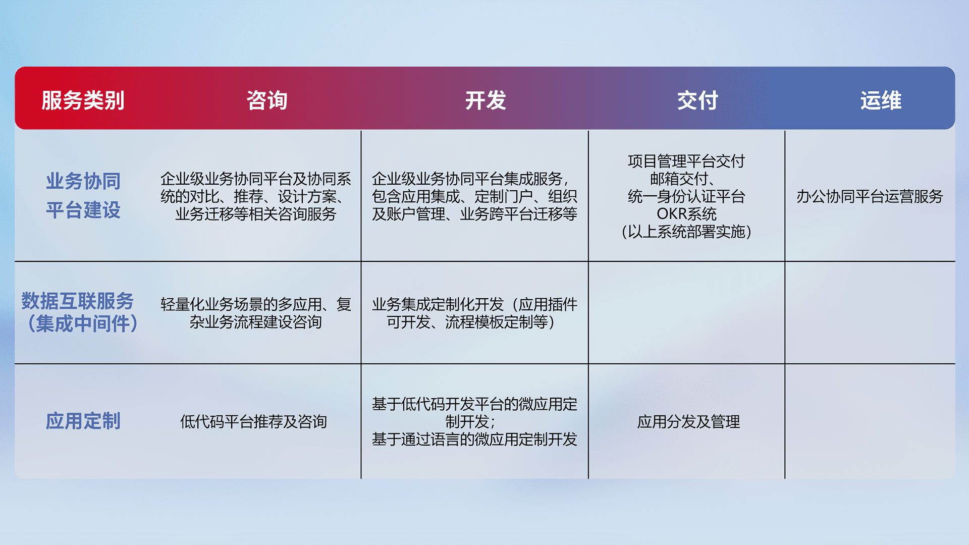 针对钉钉、、、、企微、、、IDaas等平台级产品提供产品的规划、、方案、、、、交付、、定制化开发等服务,,实现如统一协同办公、、智能客户服务、、、混合会议管理、、、、智能数据查询、、、、等业务场景,,,实现数字化转型。。。